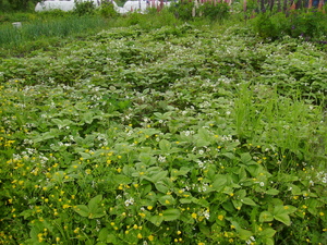 The plot has trees, including young apple trees, pears, plums, currants, raspberries, gooseberries, chokeberries, and sea buckthorn. The entire property is fenced with chain-link fencing.